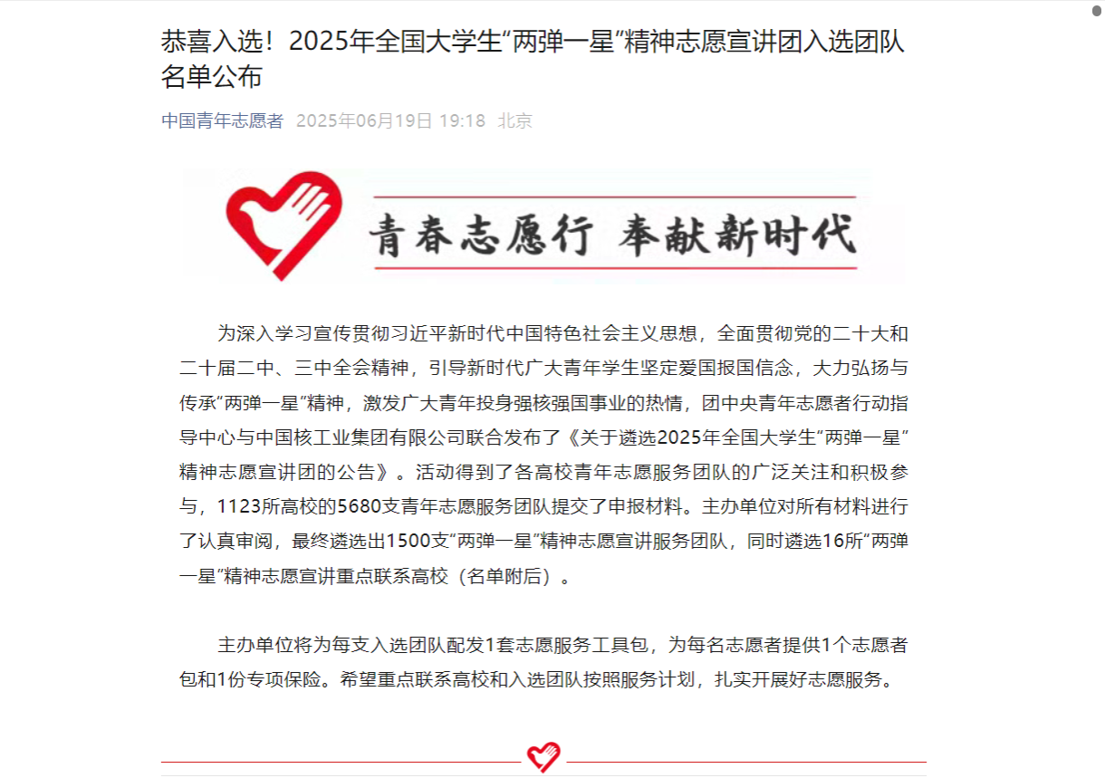链接:恭喜入选!2025年全国大学生“两弹一星”精神志愿宣讲团入选团队名单公布