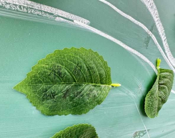 本次活动准备为同学们准备了大量栩栩如生的假树叶和色彩丰富的马克笔。同学们热情高涨,纷纷拿起笔,在树叶上认真书写。有的同学写下自己的名字,希望在这场与自然的约会中留下专属印记;有的同学则倾诉着对大自然的赞美,“每一片树叶都是自然的诗篇,愿我们永远守护这份美好”。